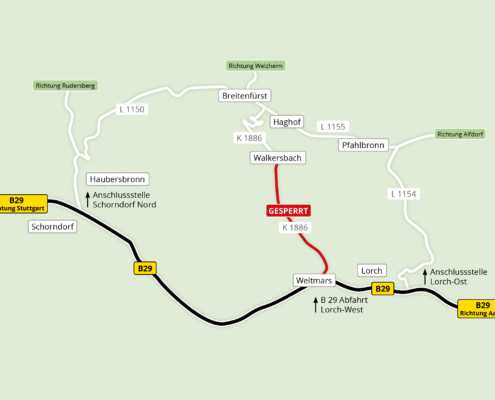 Die Verbindungsstraße von der B 29 Abfahrt Lorch-West nach Walkersbach ist von Montag, 2. März 2026 bis Freitag, 7. April 2026 gesperrt.